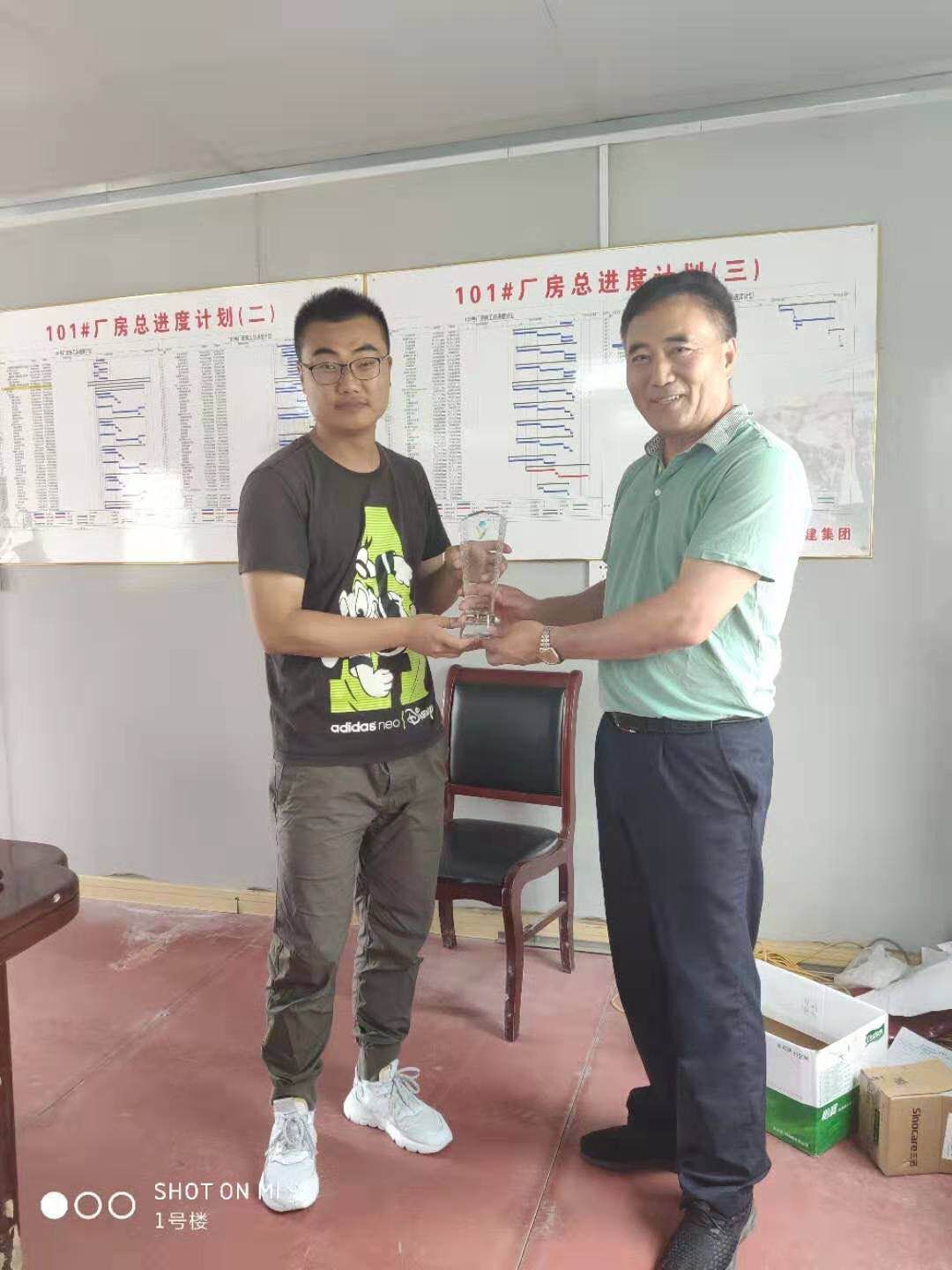 揚(yáng)建網(wǎng)訊 6月16日,開(kāi)發(fā)區(qū)投資服務(wù)局局長(zhǎng)翟學(xué)義代表開(kāi)發(fā)區(qū)管委會(huì)向我集團(tuán)TPI風(fēng)機(jī)葉片生產(chǎn)廠房項(xiàng)目部贈(zèng)送了錦旗和獎(jiǎng)杯。