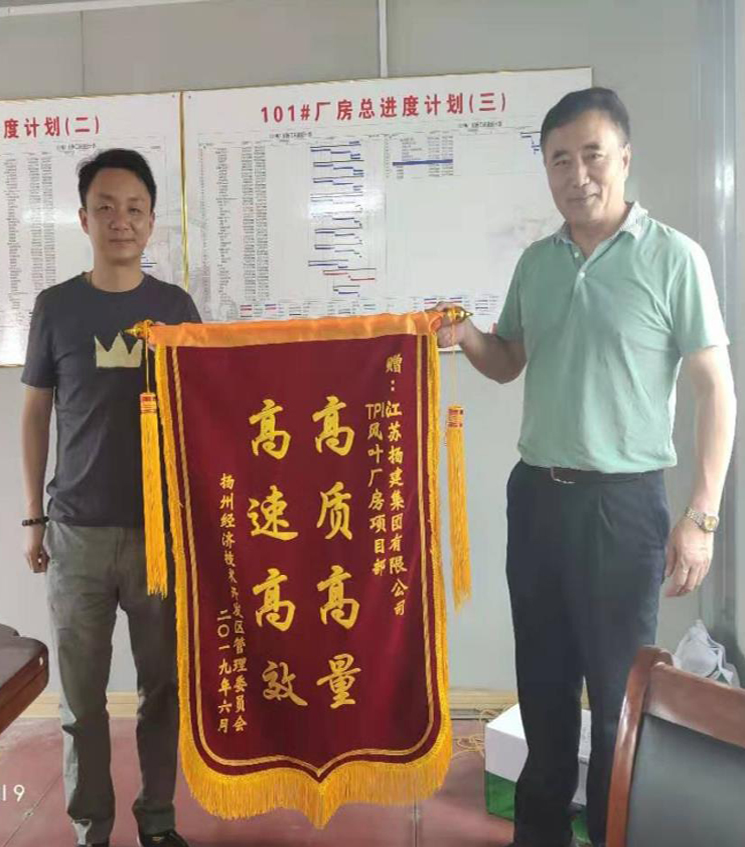 TPI風(fēng)機(jī)葉片生產(chǎn)廠房建設(shè)工程是開(kāi)發(fā)區(qū)管委會(huì)2018年度重大招商引資項(xiàng)目,總建設(shè)規(guī)模達(dá)到87409平方米,合同工期僅有200天。在巨大的工期壓力面前,項(xiàng)目部全體管理人員充分發(fā)揮揚(yáng)建人“艱苦卓絕、不怕吃苦”的精神,克服重重困難,在約定工期內(nèi),保質(zhì)保量的完成全部工作內(nèi)容,交付廠方完成調(diào)試且順利投產(chǎn),得到開(kāi)發(fā)區(qū)管委會(huì)領(lǐng)導(dǎo)的高度肯定并向項(xiàng)目部贈(zèng)送了“高質(zhì)高量 高速高效”錦旗和“杰出貢獻(xiàn)獎(jiǎng)”的獎(jiǎng)杯。