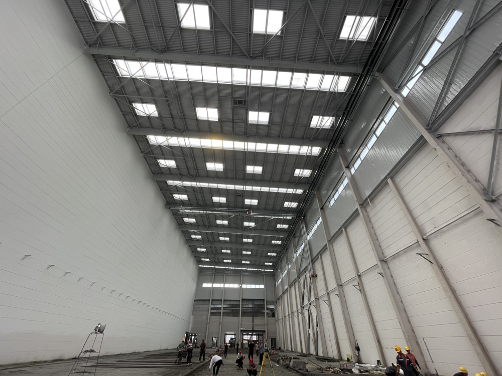 同時進(jìn)場,分進(jìn)合擊。隔墻板安裝隊組、地坪隊組、油漆隊組等多家隊組同時入場施工,面對多隊組交叉作業(yè),項目部做好了充分的計劃安排及保障措施。4000多平方米、24米高的立面隔墻板安裝,兩家隊組從東西兩個方向同時安裝,30個工人,耗時140多小時,安裝了2000多塊隔墻板。過程中,安裝隊組攻克了預(yù)制的ALC墻板訂貨周期長、工人在夏季長時間高空作業(yè)等各種困難。油漆隊組緊跟安裝隊組,隔墻板裝好一個工作面就緊跟另一個工作面。墊層、防潮膜、保護(hù)層、放線、扎鋼筋、鐵件預(yù)埋、關(guān)模、澆筑地坪……在有限的時間里道道工序,層層把關(guān),都有條不紊地順利完成。
