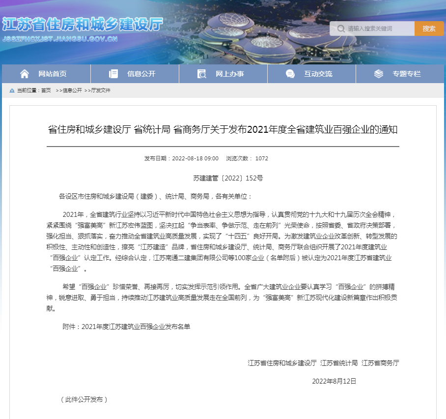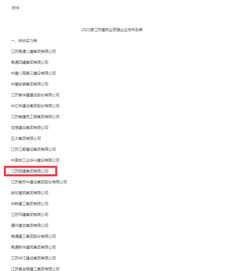 近日,江蘇省住房城鄉建設廳、統計局、商務廳聯合發布 “2021年度江蘇省建筑業百強企業”榜單,江蘇揚建