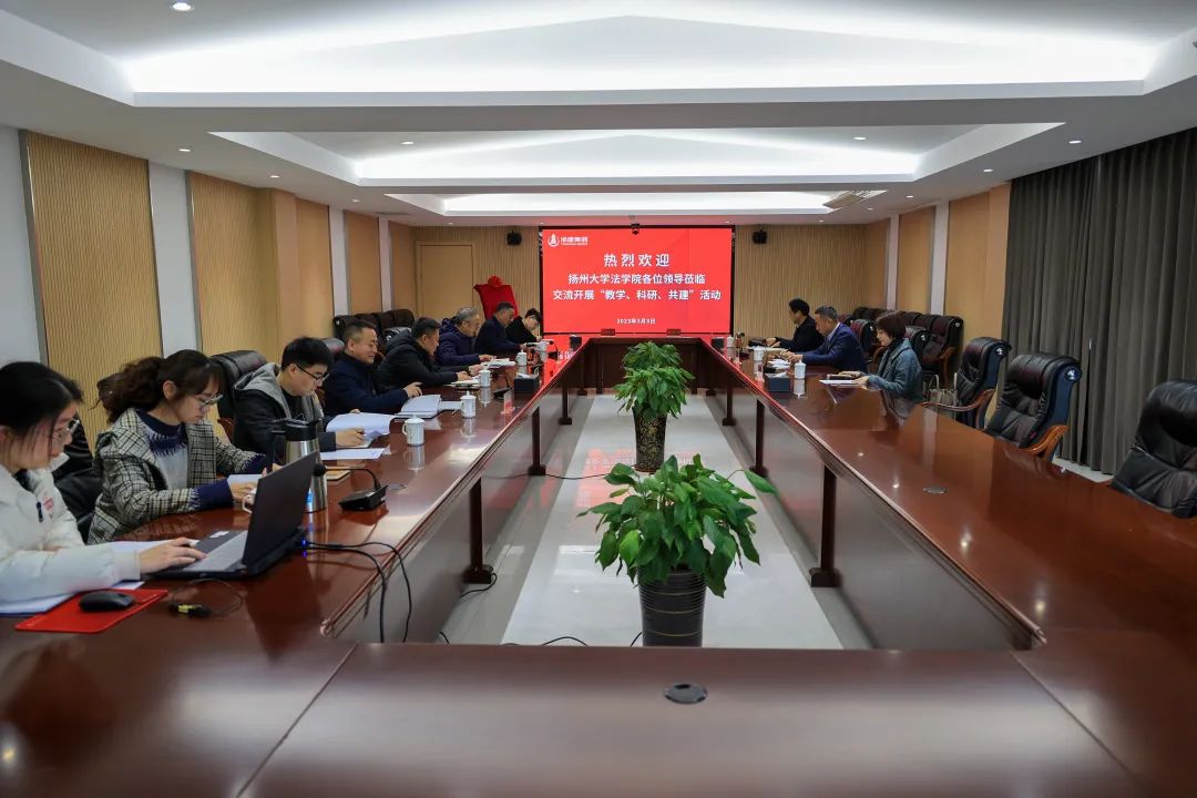 活動(dòng)過(guò)程中,雙方在B座二樓會(huì)議室進(jìn)行了廣泛、深入的交流座談,并舉行了揚(yáng)州大學(xué)法學(xué)院“教學(xué)科研實(shí)踐基地”共建協(xié)議簽約儀式,和揚(yáng)州大學(xué)法學(xué)院“教學(xué)實(shí)習(xí)基地”合作共建揭牌儀式。