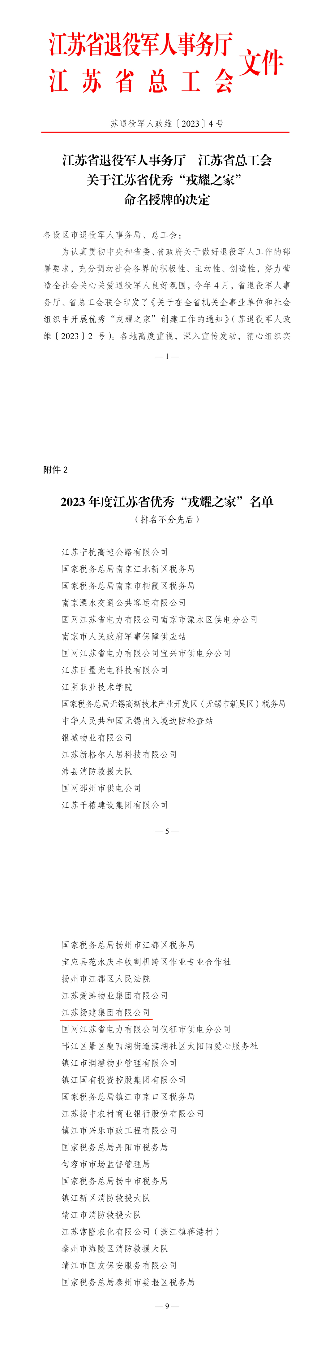 近日,江蘇省退役軍人事務廳、江蘇省總工會聯合發布《關于江蘇省優秀“戎耀之家”命名授牌的決定》,揚建集團經過自主申報、縣(市、區)推薦、市級審查、專家評審、實地驗收、省級綜合評定、網上公示等程序,獲評2023年度江蘇省優秀“戎耀之家”。