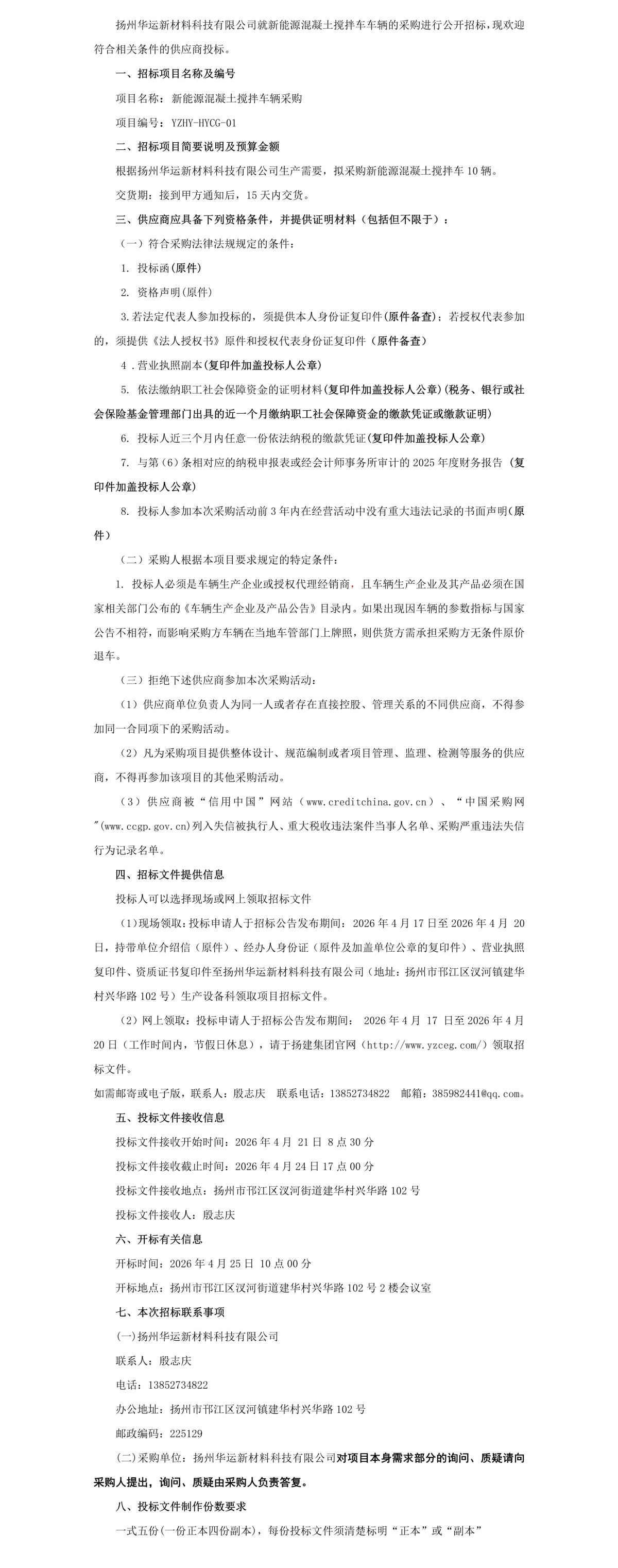 揚州華運新材料科技有限公司純電動混凝土攪拌車輛采購公開招標