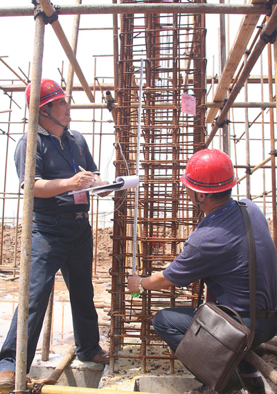 考核現場地劃分為A、B、C、D、E五個賽區,每個賽區的企業考評專家、考評監督員和考評員根據技師考核標準負責對賽區內的8名選手進行現場考評。選手按照考核項目要求,在規定的時間內依據現場提供的施工圖紙,完成框架柱箍筋數量計算、箍筋綁扎、安放保護層、清理現場等操作。賽前,企業考評專家做了技術和安全交底,每位選手都將施工圖紙內容牢記于心,隨著裁判長的一聲令下,所有選手爭相步入指定位置,迅速投入到了競賽中:量間距、套箍筋、鋼筋綁扎、安放保護層……,每位選手都嫻熟地運用著手中的工具搶時間、拼質量,顯敏捷身手。競賽過程中,雖然頭頂烈日,但絲毫沒有影響到選手的發揮,整個競賽現場秩序井然。